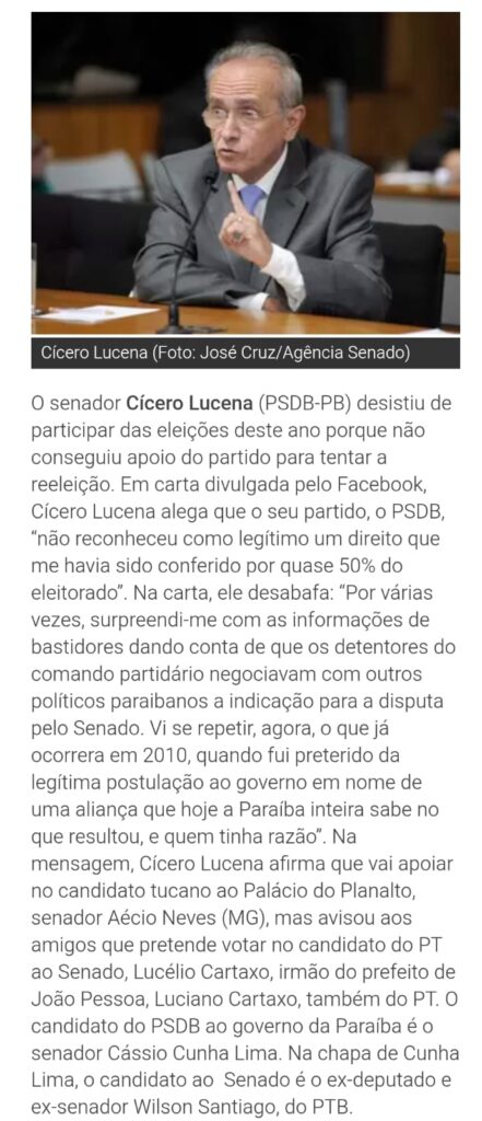 Hoje, Cícero recebe o abraço pessonho dos Cunha Lima, mas parece ter esquecido o que viveu em 2014, quando seria o candidato natural ao Senado Federal na chapa encabeçada por Cássio Cunha Lima. Naquela ocasião, Cássio não lhe deu a oportunidade de disputar a reeleição, preferindo entregar o posto a Wilson Santiago. O gesto, frio e calculado, praticamente baniu Cícero da vida pública e o deixou politicamente arrasado.