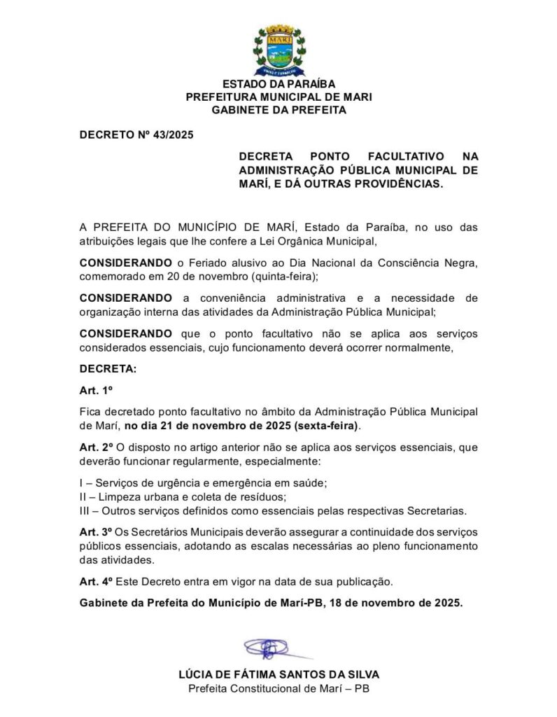 A prefeita do município de Mari, Lucinha da Saúde, publicou nesta terça-feira (18) o Decreto nº 43/2025, estabelecendo ponto facultativo na administração pública municipal no dia 21 de novembro de 2025, em decorrência do Dia Nacional da Consciência Negra, comemorado oficialmente no dia 20 de novembro.