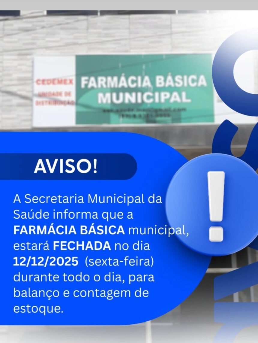 A Secretaria Municipal de Saúde informa que a Farmácia Básica Municipal estará fechada nesta sexta-feira, dia 12 de dezembro de 2025, durante todo o dia.