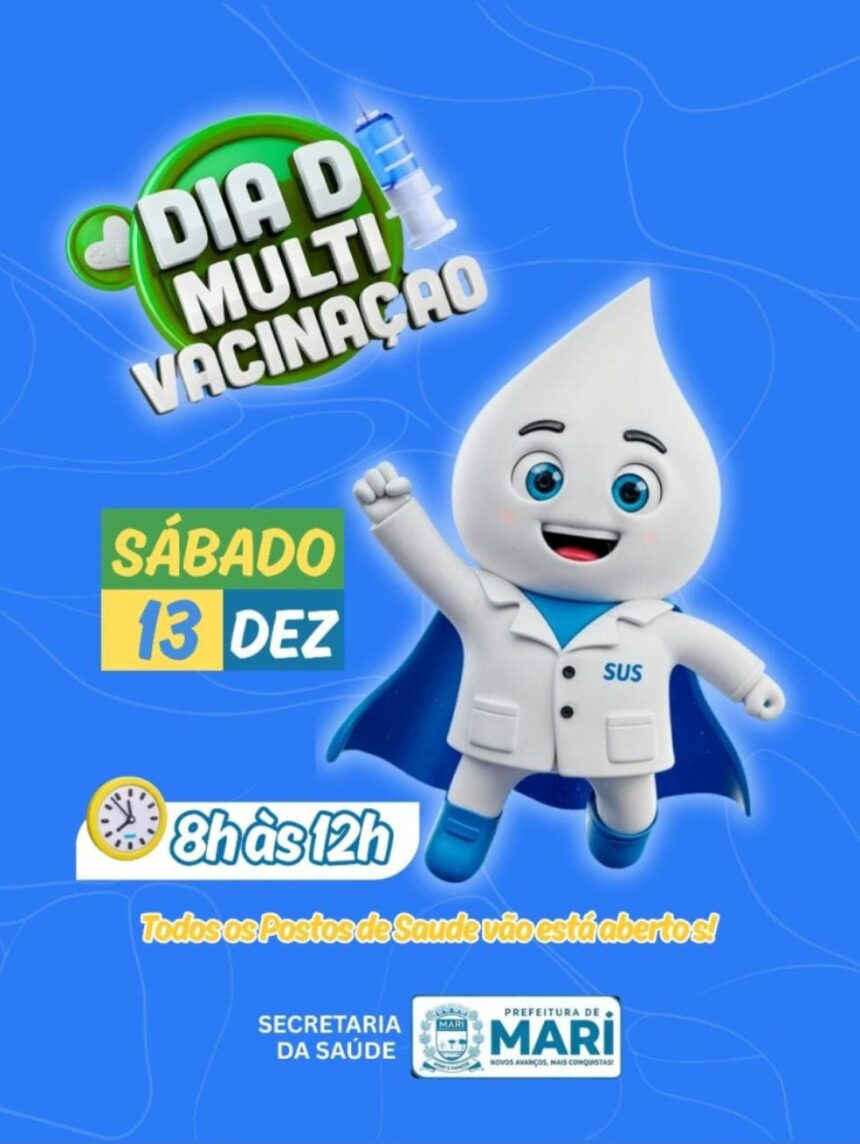 A cidade de Marí promove, neste sábado (13 de dezembro), o Dia D da Multivacinação, uma mobilização estratégica da saúde pública para garantir a atualização das cadernetas de vacinação de crianças, adolescentes e adultos. Todas as unidades de saúde do município estarão abertas das 8h às 12h, prontas para receber a população que deseja encerrar o ano com mais saúde, proteção e segurança sanitária.