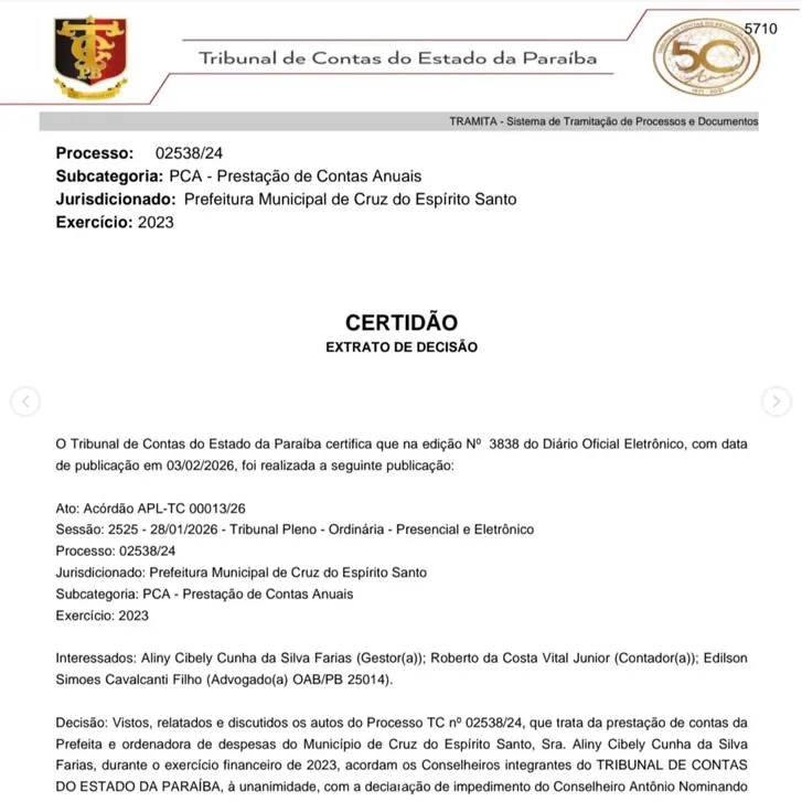O Tribunal de Contas do Estado da Paraíba (TCE-PB) julgou irregulares as contas da prefeita Aliny Cibely Cunha da Silva Farias, relativas ao exercício financeiro de 2023. A decisão consta no Acórdão APL-TC 00013/26, aprovado por unanimidade pelo Pleno da Corte, e foi publicada no Diário Oficial Eletrônico nesta terça-feira, 3 de fevereiro de 2026.