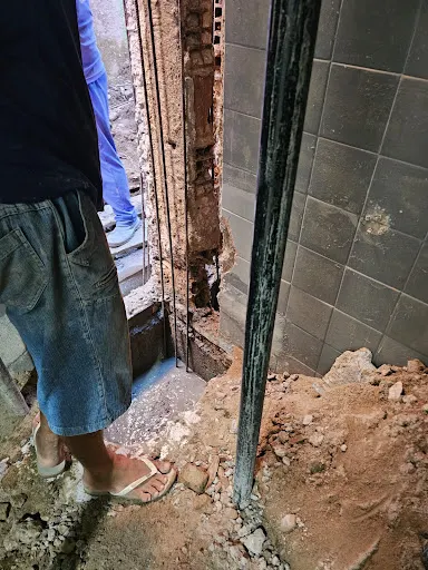 Entre os serviços executados, está a reestruturação completa de dois pilares do prédio, desde a base da fundação até a parte superior da estrutura. Esse tipo de intervenção exige abertura de paredes, escavação na base, recomposição de ferragens e reconstrução do concreto estrutural.