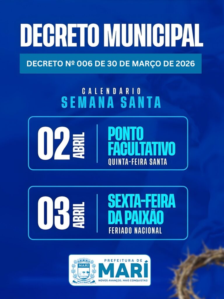 A Prefeitura de Marí publicou Decreto com o calendário oficial de funcionamento dos órgãos públicos durante a Semana Santa, estabelecendo alterações no expediente em respeito às tradições religiosas e ao feriado nacional celebrado em todo o país.