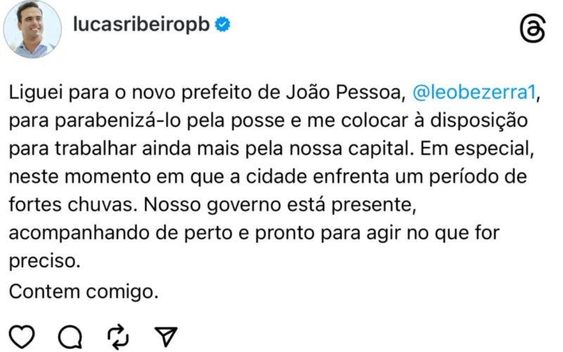 “Liguei para o novo prefeito de João Pessoa, Léo Bezerra, para parabenizá-lo pela posse e me colocar à disposição para trabalhar ainda mais pela nossa capital. Em especial, neste momento em que a cidade enfrenta um período de fortes chuvas”, escreveu o governador.